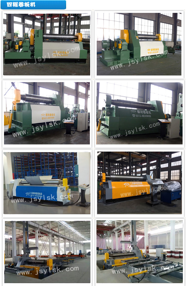 該機結(jié)構(gòu)型式四輥式,上輥為主傳動,通過減速機的輸出齒輪與上輥齒輪嚙合,為卷制板材提供扭矩;下輥作垂直升降運動,通過液壓缸內(nèi)的液壓油作用于活塞而獲得,以便夾緊板材,為液壓傳動;在下輥的兩側(cè)設(shè)有側(cè)輥并沿著機架導(dǎo)軌作傾運動,通過絲桿絲母蝸輪蝸桿傳動;該機優(yōu)點是板材端部預(yù)彎及卷圓可以在同一臺設(shè)備上進行。